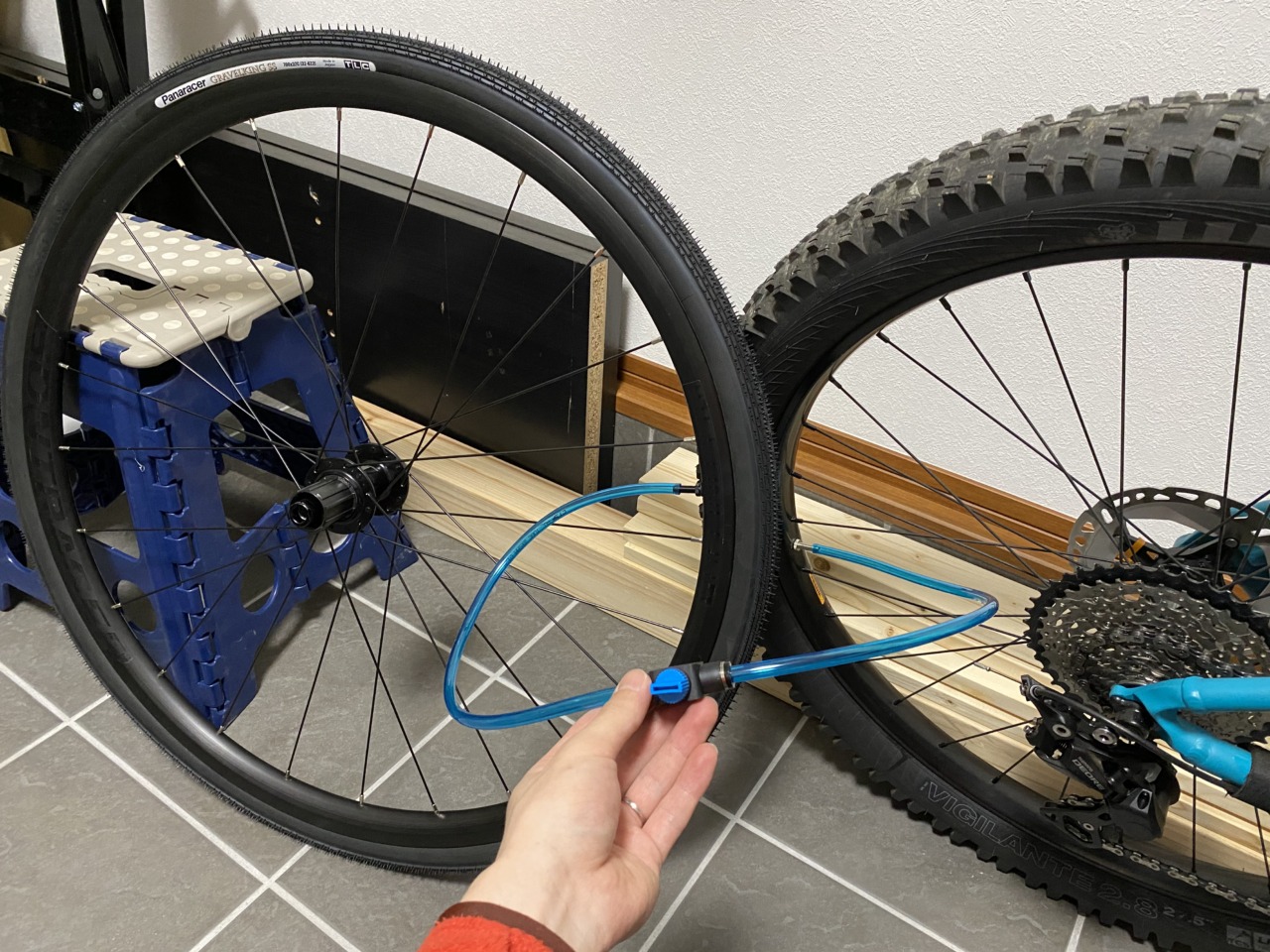 この時MTBホイールのバルブコアは外して、ホースをバルブに直挿しする。