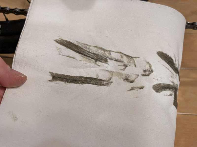 チェーンオイル注油後の拭き取りでは、ウエスに付着した汚れはこの程度だった。
