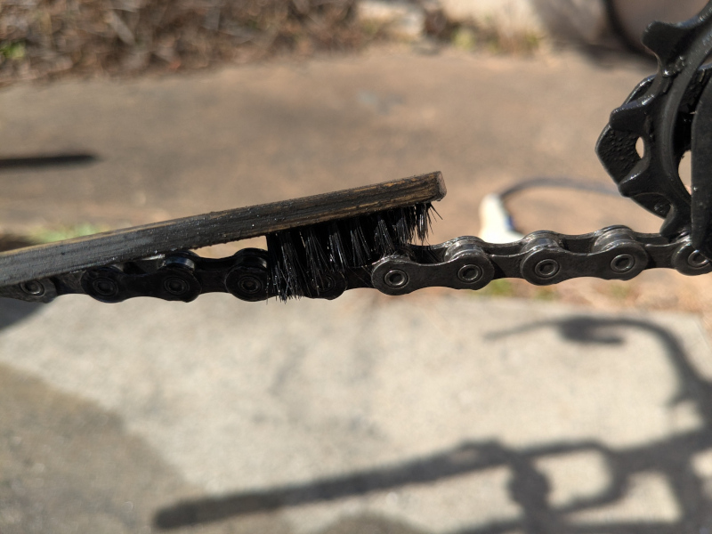 チェーンクリーナーを吹き付けた後は、ブラシでチェーンを擦っていく。